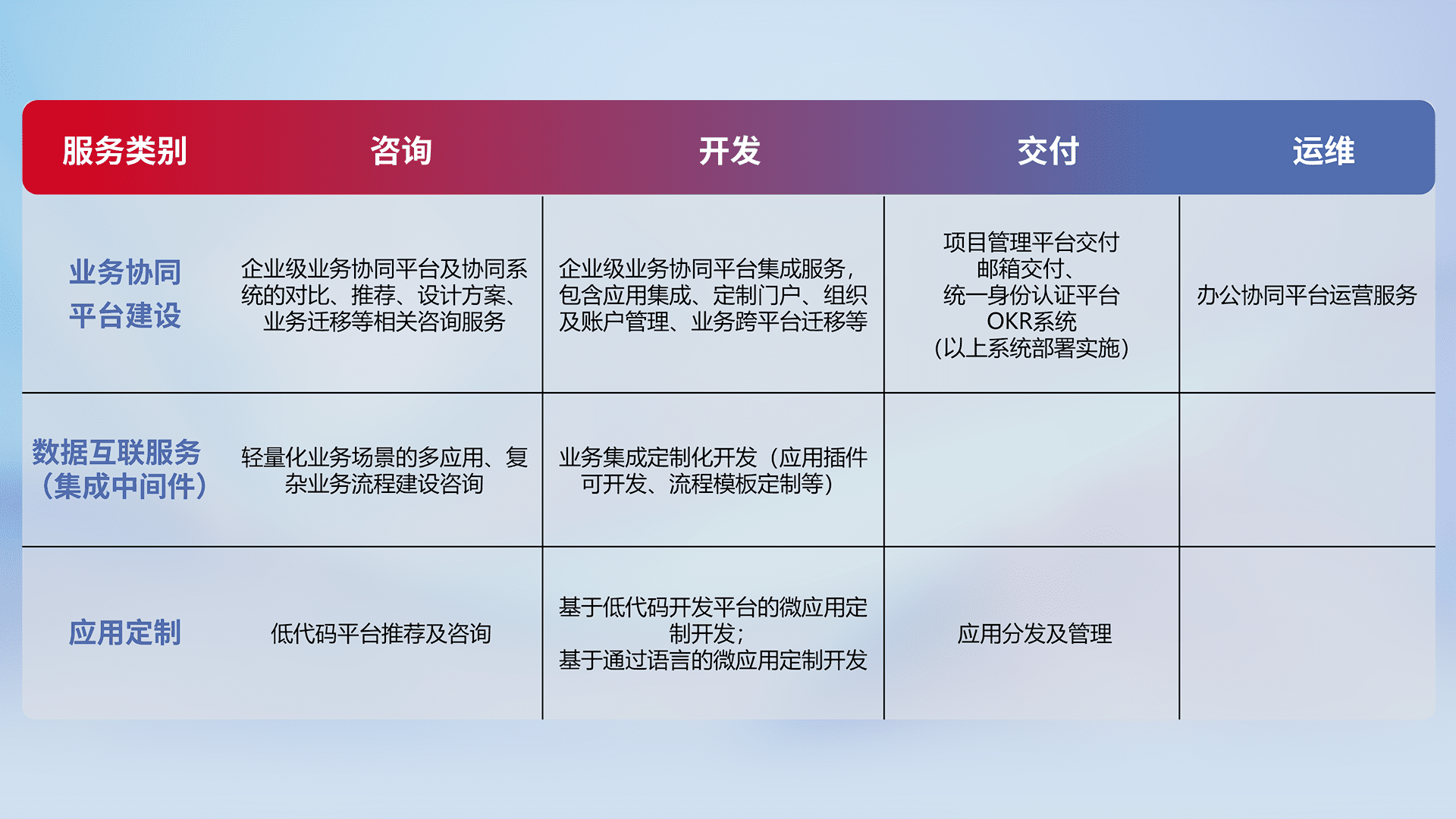 针对钉钉、、企微、、、、IDaas等平台级产品提供产品的规划、、方案、、、交付、、定制化开发等服务,,实现如统一协同办公、、、、智能客户服务、、混合会议管理、、、智能数据查询、、、等业务场景,,,,实现数字化转型。。